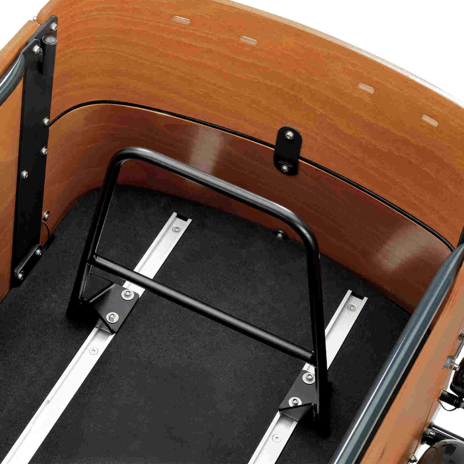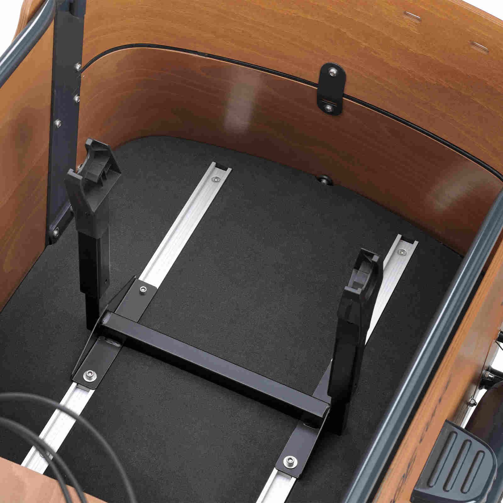Die geräumige Transportbox verfügt über eine durchgehende, breite Sitzbank, die bis zu zwei Kindern einen sicheren und bequemen Sitzplatz bietet. Möchten Sie Ihr Baby mitnehmen? Das Modell ist mit Zubehörschienen in der Box ausgestattet, an denen z. B. eine Maxi-Cosi-Halterung einfach und sicher befestigt werden kann. (Bitte beachten: Durch die Montage der Maxi-Cosi-Halterung verringert sich der Sitzplatz auf der Bank.)